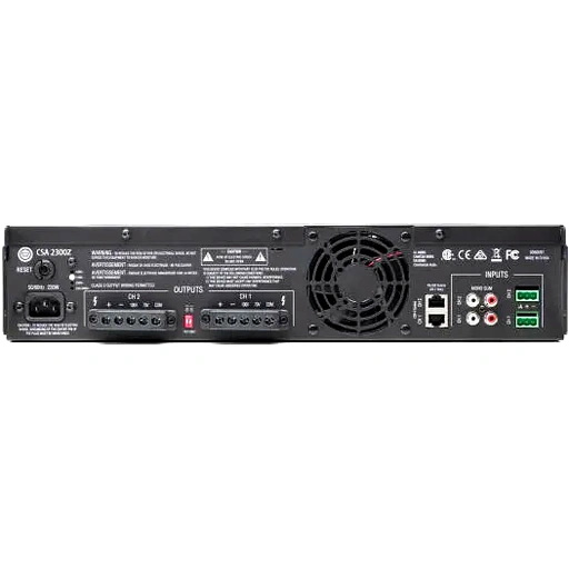 Built for installed sound applications, the CSA 2300Z Dual-Channel 300W Amplifier from JBL delivers powerful sound and efficient performance using the Crown’s DriveCore commercial power amplifier technology. Simple to configure, this amplifier provides a DriveCore-based sound solution, which utilizes one small chip that significantly reduces the part count and increases reliability while still maintaining high performance. It provides amplification with a choice of low impedance, 70V or 100V outputs. The amp includes a rack mounting kit for installations to a cabinet, and a RJ45 connector for an optional remote volume control using JBL’s CSR-V control module.