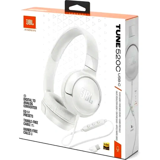 Hi-Res Audio Enjoy crystal-clear, high-resolution 96kHz/24bit audio that brings out the best in your music, delivering superior sound quality. JBL Pure Bass Sound Experience deep, powerful bass from the 32mm dynamic drivers, a hallmark of JBLs signature sound. Wide Compatibility Plug the JBL Tune 520C headphones into any device with a USB-C connection, including PCs, laptops, mobile phones, tablets, and gaming devices. (Please check USB-C compatibility with your device.). 3-Button Remote with Microphone Take hands-free calls with the built-in microphone and control your music playback, adjust volume, or switch EQ presets using the convenient 3-button remote. EQ Presets Choose from preset sound modes, including Bass to enhance low-end frequencies or Vocal for brighter, clearer vocals.